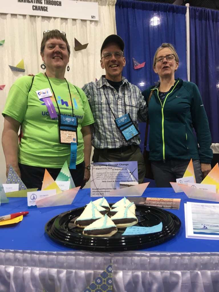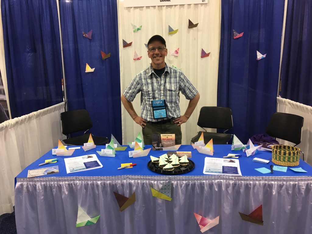 I have a “booth” in the exhibit area and yes, so many hands have been part of creating it. My mom who made the paper sailboats, my former colleague and friend Shelia on the left of this picture who made the sailboat cookies, Sheila’s husband Steve who made a box for business cards, my sister Nancy who helped me set up the display. So grateful for asking for asking for help – and getting it!