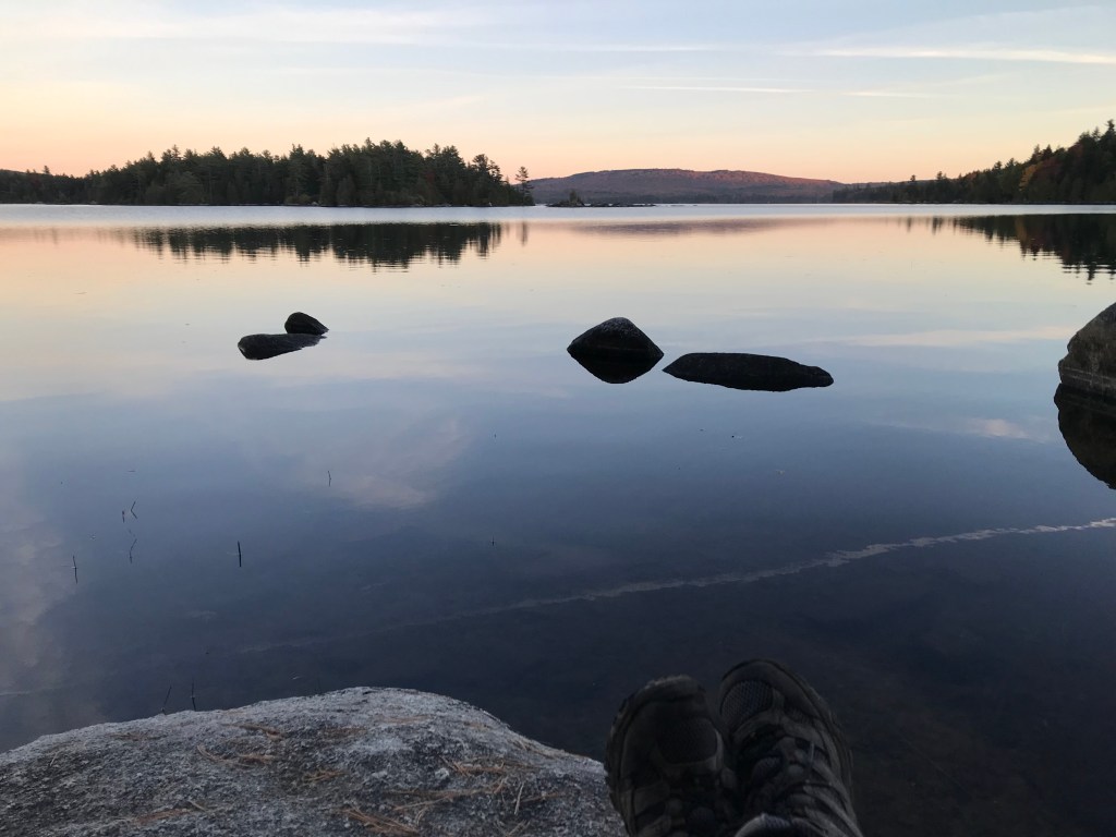 Later, back here at Bald Mountain Pond. Sitting again on the warm rock, the lake clear, serene. The loon trills her morning call again and again.