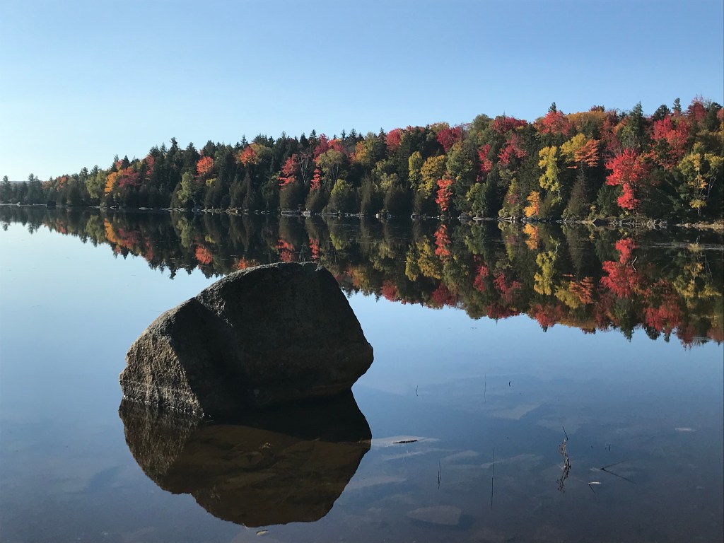 I wake to the pond covered in dense fog. Sitting here on the rock, a flutter of wings behind me as I turn my head. Red squirrel crackling leaves, now chattering angrily above. A beaver hunches on the rock, gnawing wood. Slips into the pond, paddles by to another rock where she hunches, gnaws on another stick as the loon sings and sings. An owl calls. Woodpecker taps. The rock reflected in the still pond. The fog thick and still.