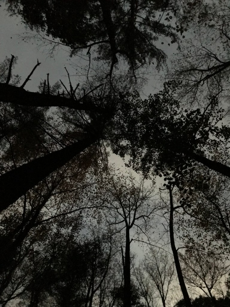 I stand for a moment amidst tall dark trees. At the upper branches, leaves twirling in the wind, golden leaves gently falling in the breeze. To let go like this, to release what we need no longer carry. If only it were that easy. Perhaps it is.