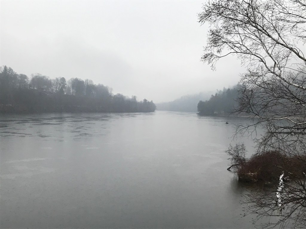 It’s a day not unlike another day I’d have a week later in Brattleboro, Vermont. I’d come over the night before to avoid the freezing rain predicted for that morning and sure enough I wake to yet another gray fog, this time wet and slippery. I pause on my morning run over the bridge to take a picture down the Connecticut River.