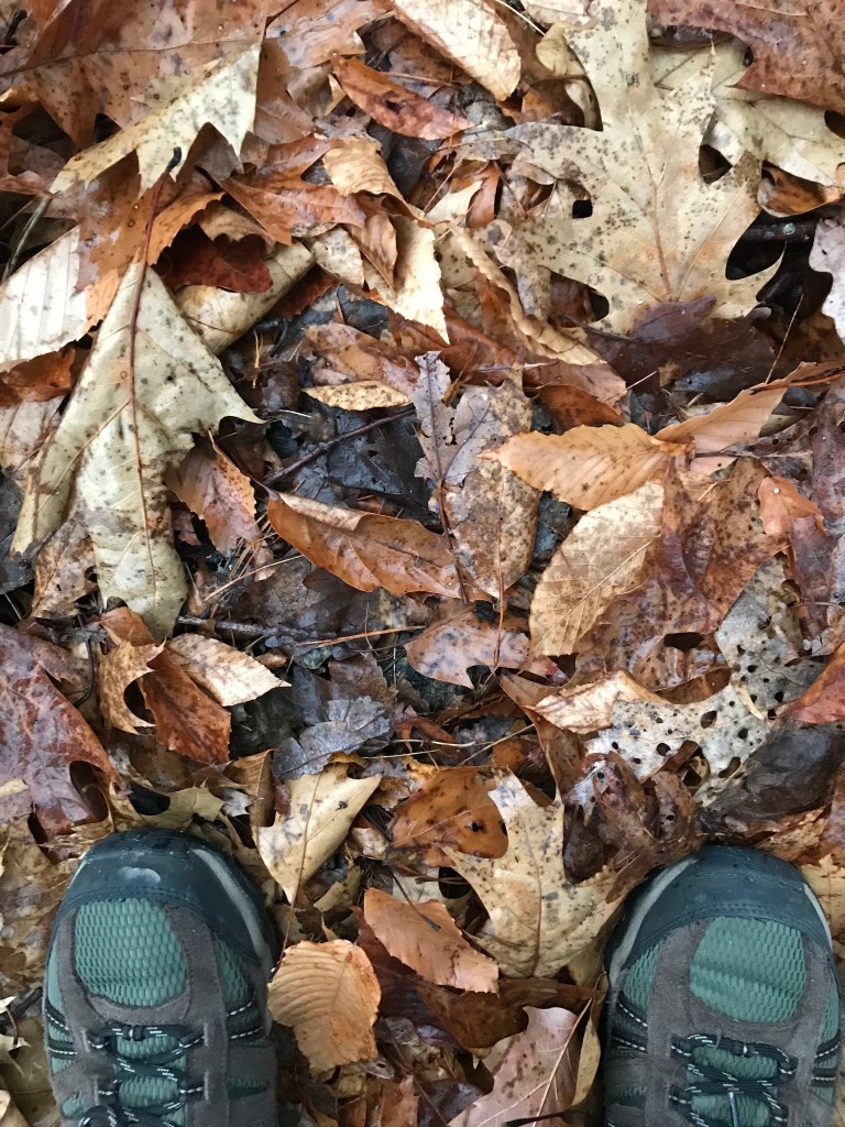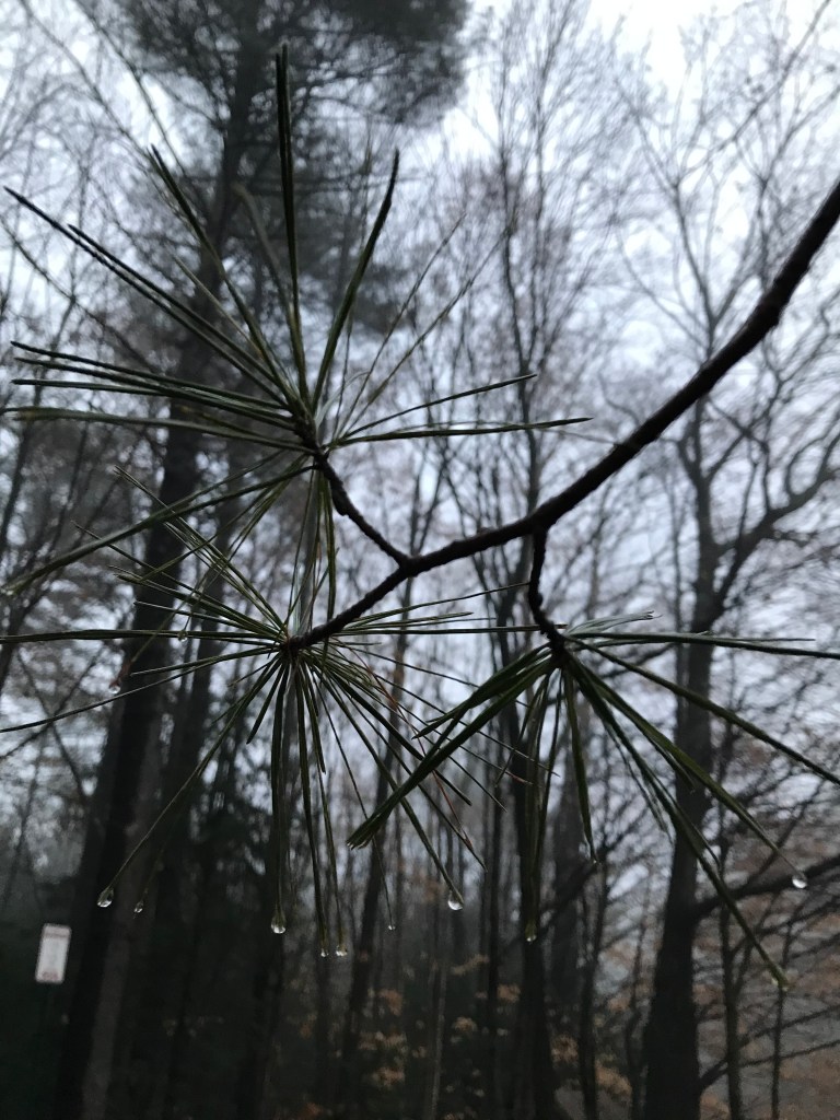 I go back to look at the pictures – lots of brown leaves, gray fog, cold and damp, a slight mist turned to drizzle. I remember hearing that beech trees are the last to lose their leaves. Perhaps they’re beech still holding on in an evergreen forest of dark wet trunks covered with patches of green. A picture of the tips of my shoes looking down on more brown leaves. Drips of water on the ends of white pine needles. So cold, so damp and so looking forward to this walk.