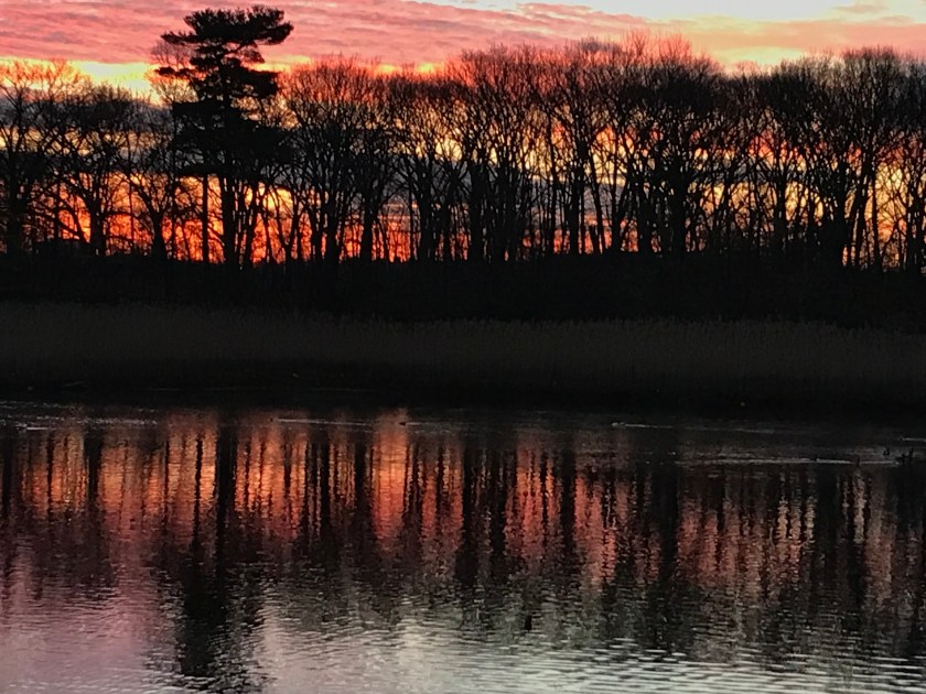 From where I sit this morning, the river turns beyond where I can see until appearing there again across the marsh golden in the setting sun.
