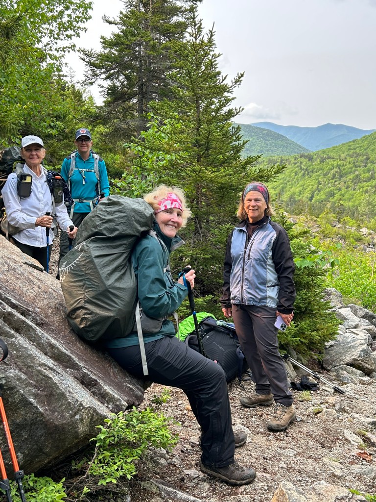 Before we set out, I’m asked to offer a water blessing for my hiking friends at the stream. (What are they thinking?). We share our thanks for the gift of this thundering stream water and so many things we have discovered out here like laughter and lady-slippers, delicious hot meals at the hut and hamburgers on the ride over to the trail. For Roger and each other. As we close, I draw them over close to the pool where I’m kneeling, to splash and bless my friends to shouts of delight.