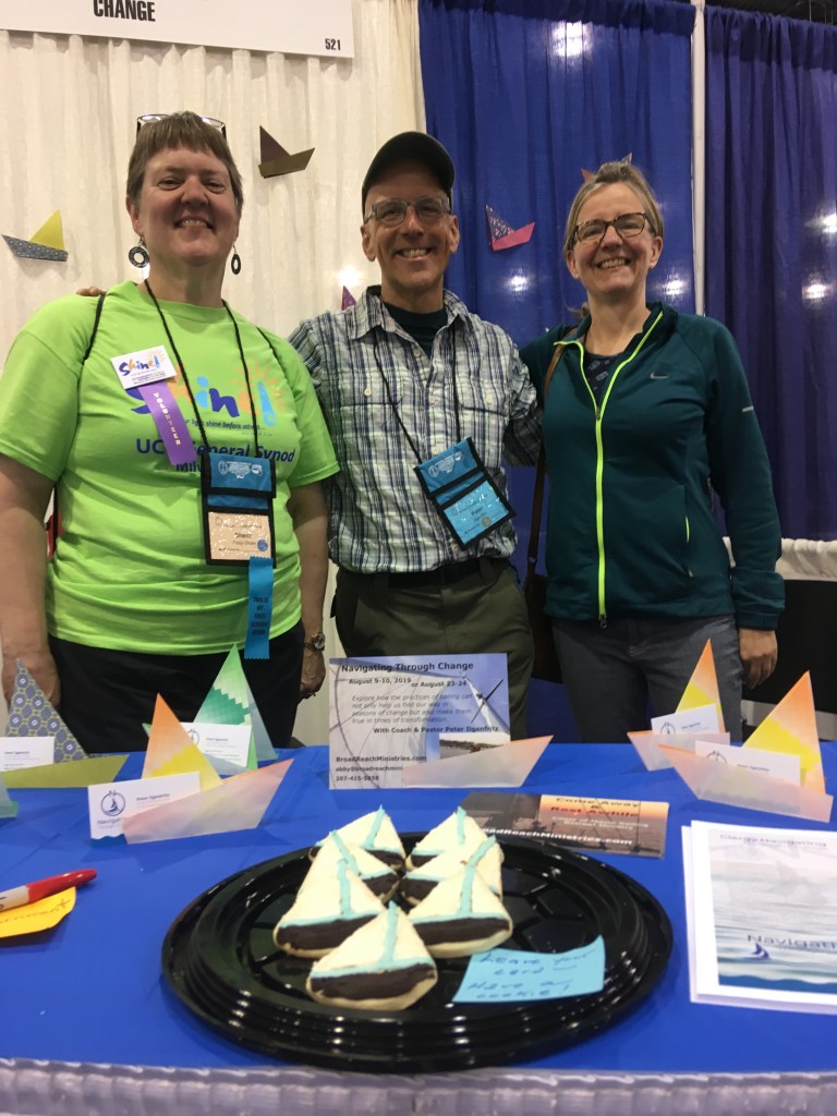 Late morning, the Exhibit Hall at the Milwaukee Conference Center, last morning of General Synod, the national United Church of Christ gathering….. I’m standing behind my little table wearing my Center for Wooden Boats ball cap, the table covered with paper sailboats holding my business cards, the last of my sailboat cookies my friend Sheila made. It’s been a fun and exhausting week – so many people I’ve talked to, connections I’ve made. A person who looks vaguely familiar comes by the table and I launch into my spiel about what “Navigating Through Change” is all about –