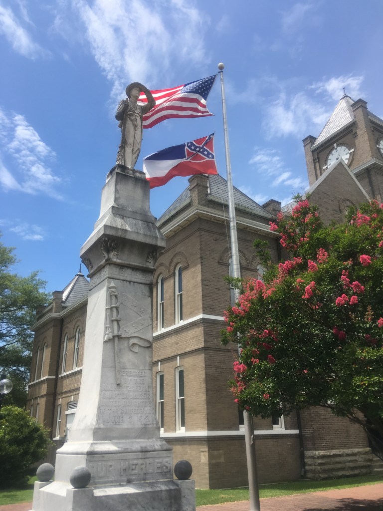 Noon, Sumner, Mississippi, sitting on the stoop of the Emmett Till Interpretive Center….. The small town square deserted, mine the only car here. An occasional passing pick up truck. Across from the county courthouse where Till’s killers were acquitted – later admitting in magazine interview that they killed him and dumped his 14 year old body wrapped in barbed wire around a rusted fan into the river. “We had to kill him,” his murderers said, “He never looked afraid.” A confederate statue to the Brave Heroes next to the flag pole – an American flag on top, Mississippi state flag below – with the confederate flag in the corner where the blue stars are on the American flag. Inside the center behind me, leaning against the wall, a bullet ridden sign marking the place where Till’s body was discovered.